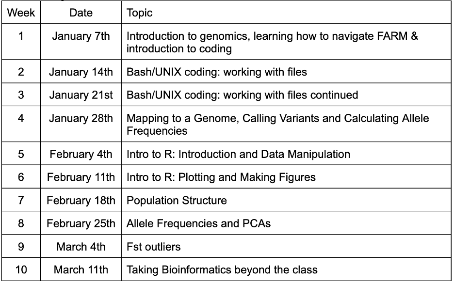 In this course we will focus on the rapidly developing field of genomics and explore examples across marine and terrestrial systems. Students will gain hands-on coding skills in command-line and R. By the end of this class, students will be able to use HPC computing resources at UC Davis, write basic scripts in bash and perform genomic analyses modifying template scripts in R. Students will also be able to describe the general bioinformatics pipeline and evaluate figures from published literature.quired, and is also your first book chapter. It will be the homepage when you render the book.