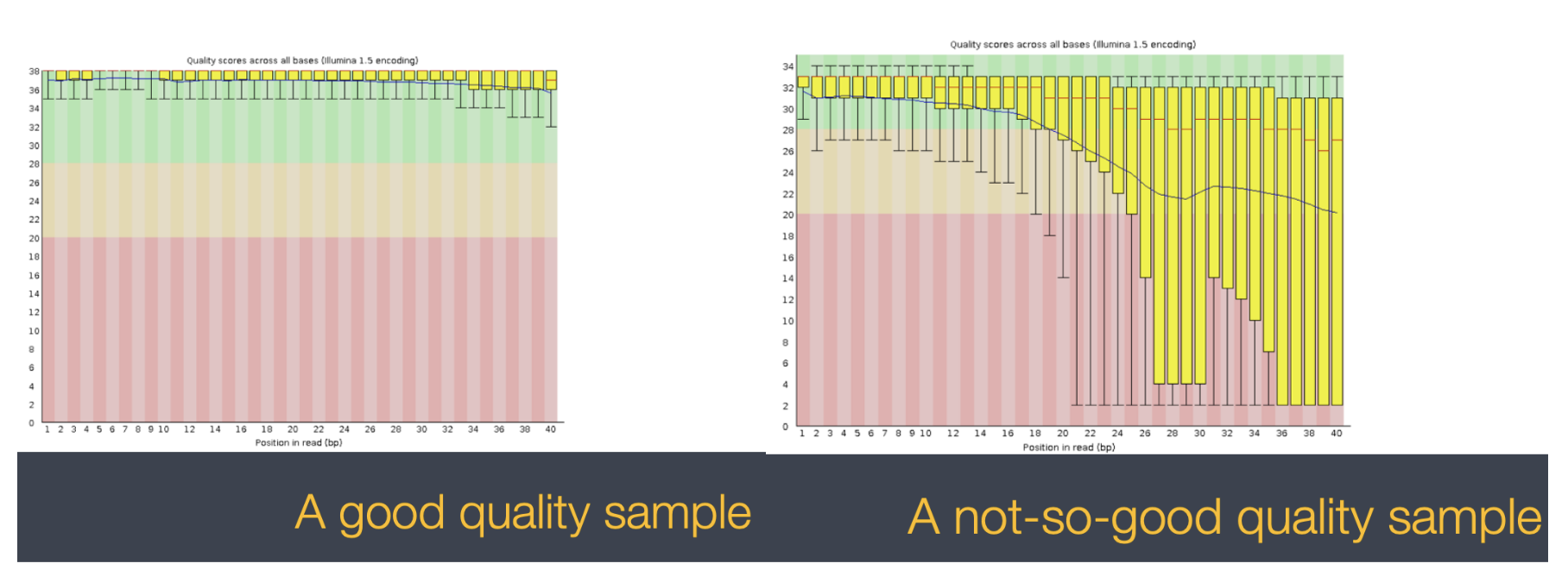 With a full dataset you will also get an html file for each sample that give you more visual representations of your sample quality. These screenshots of a good and bad QC come from tutorials from the bioinformatics core linked here: https://bioinfo-core.org/index.php/9th_Discussion-28_October_2010 We will not have these visuals for our dataset today, but it is helpful to know what else you’d be working with if this was your own dataset!