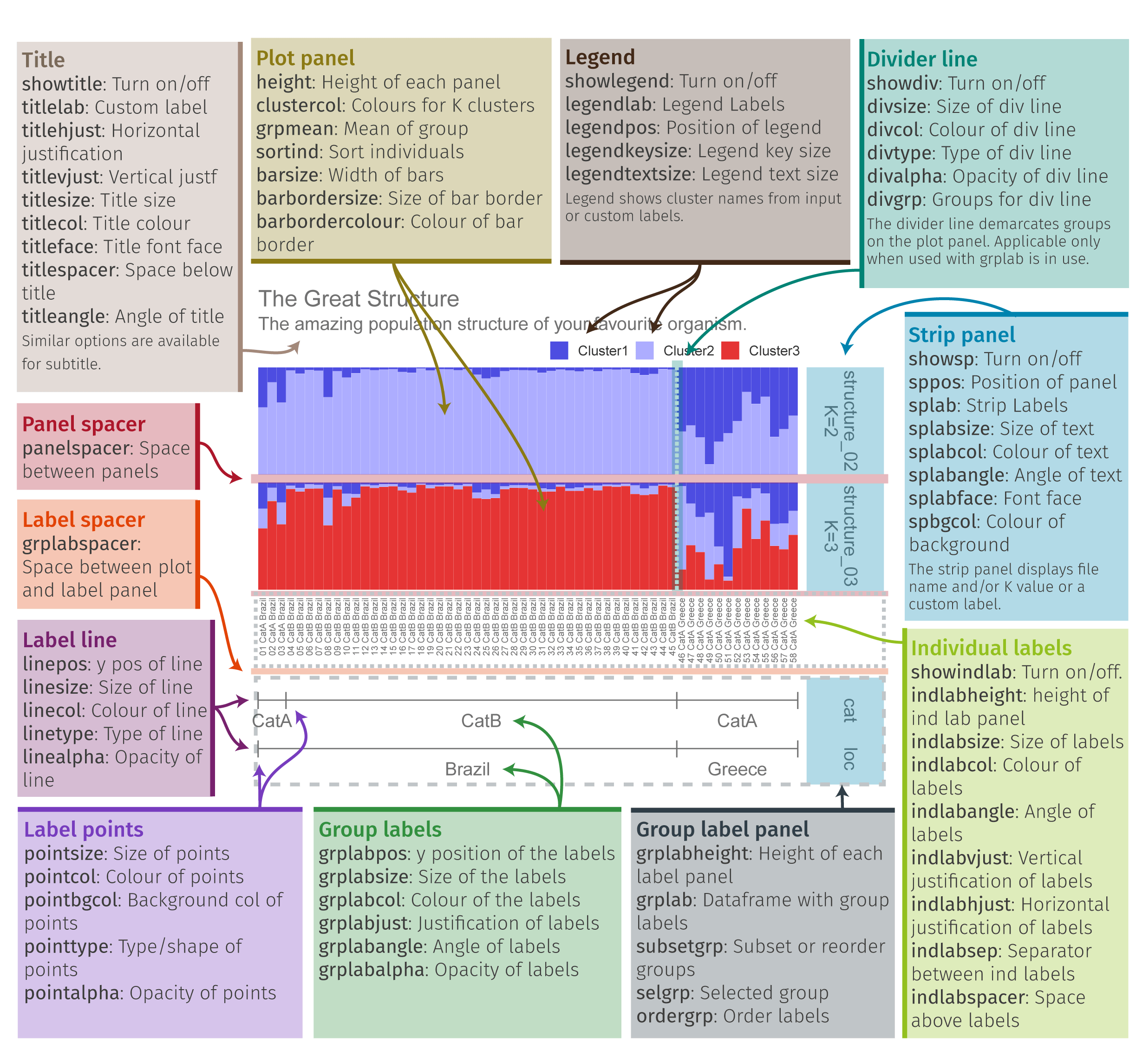 Pophelper is a really useful tool for visualizing population structure graphs. You can view the tutorial here for more information: https://www.royfrancis.com/pophelper/articles/index.html#plotting-1. We can do a lot of customization in pophelper, and this figure shows what our final result will look like!